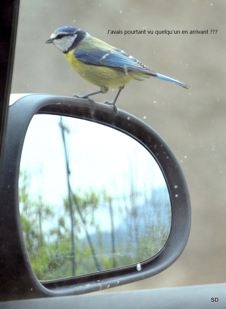 Les conditions n’étaient pas très favorables. J’étais à l’intérieur de la maison, la mésange se trouvait de l’autre côté du véhicule, il fallait donc traverser trois vitres pour pour obtenir un cliché.