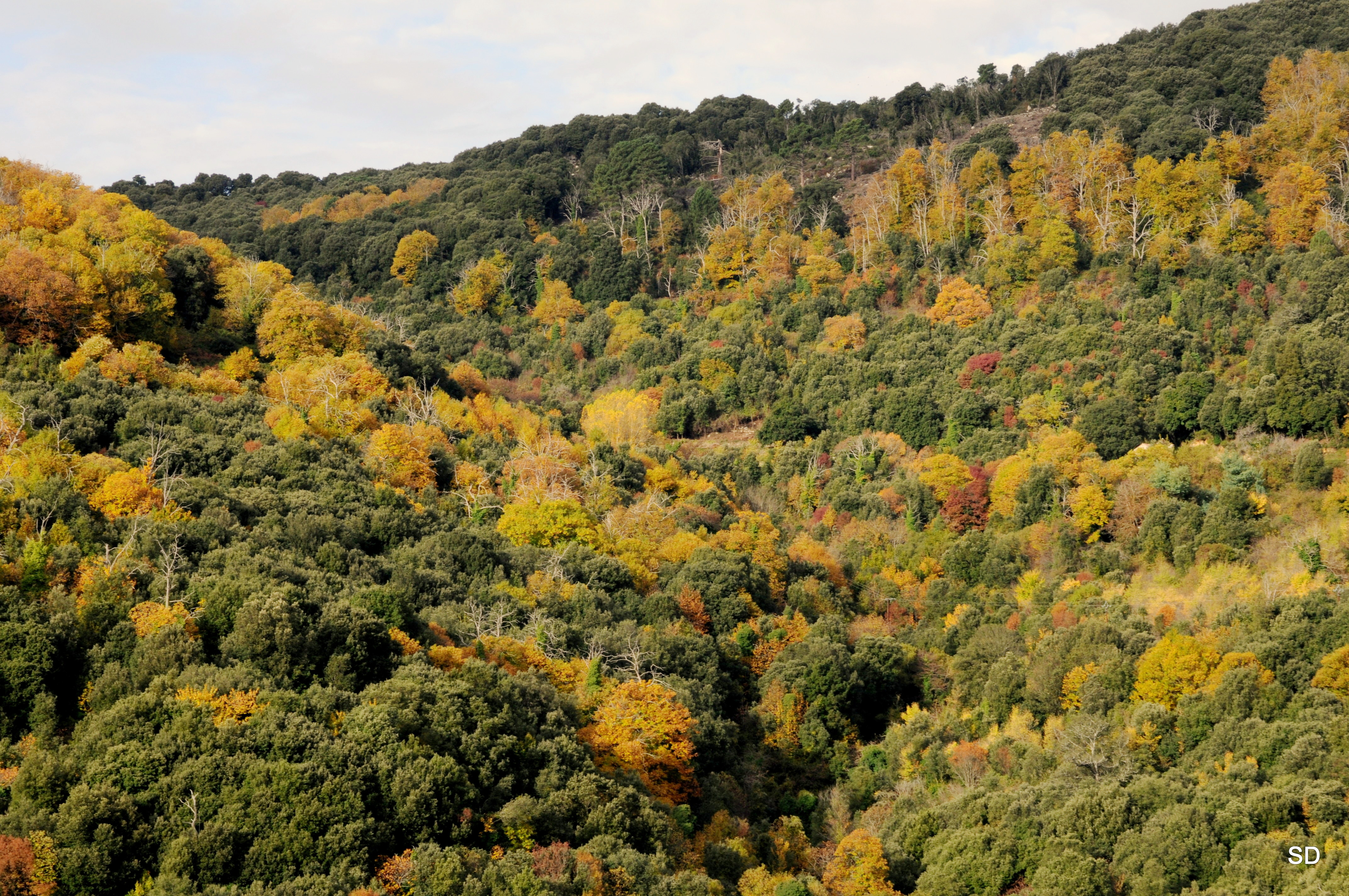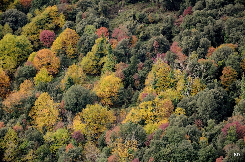 Parmi les chênes verts au feuillage persistant, d’autres essences, châtaigniers et frênes, s’automnisent de couleurs vives.