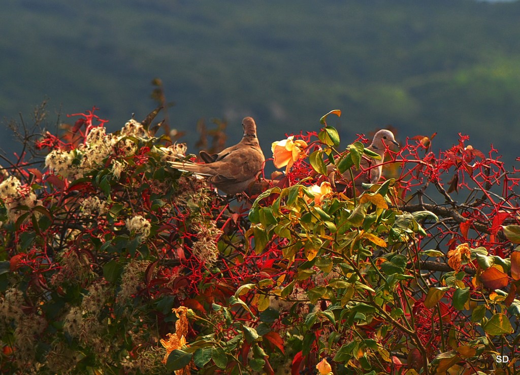 Des tourterelles avaient repéré la vigne vierge en fruits et venaient avant la tombée de la nuit se sustenter, juste face à ma croisée.