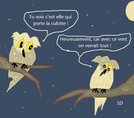 C’est épatant, car même si je ne vois plus un oiseau à travers ma vitre, les volatiles se sont égaillés, je ne sais où, à défaut, je contemple le brouillard qui se meut comme une danseuse folle et les rameaux nus des arbres qui se giflent, se crêpent les branchillons, gesticulent contre de fieffées rafales.